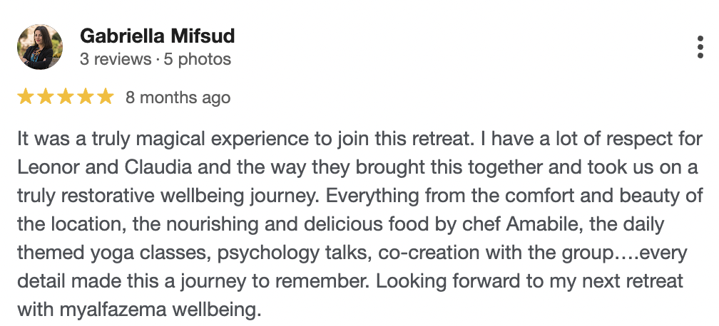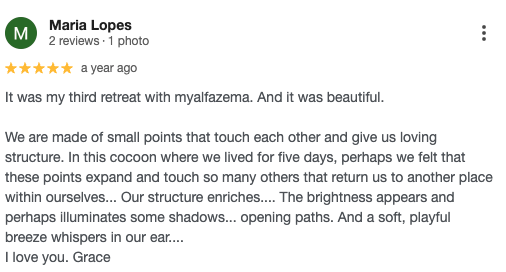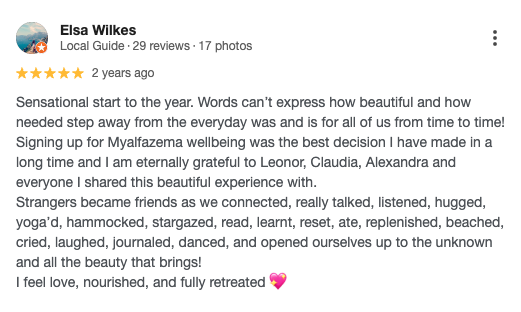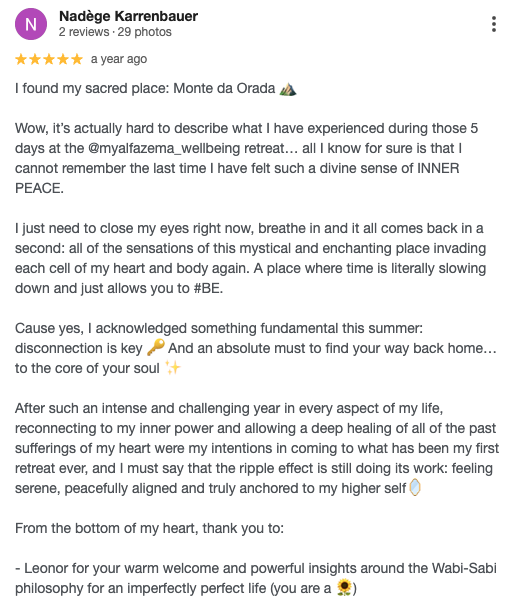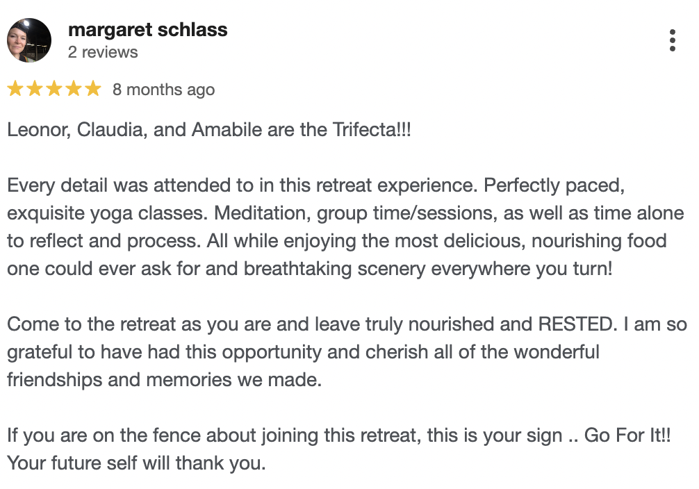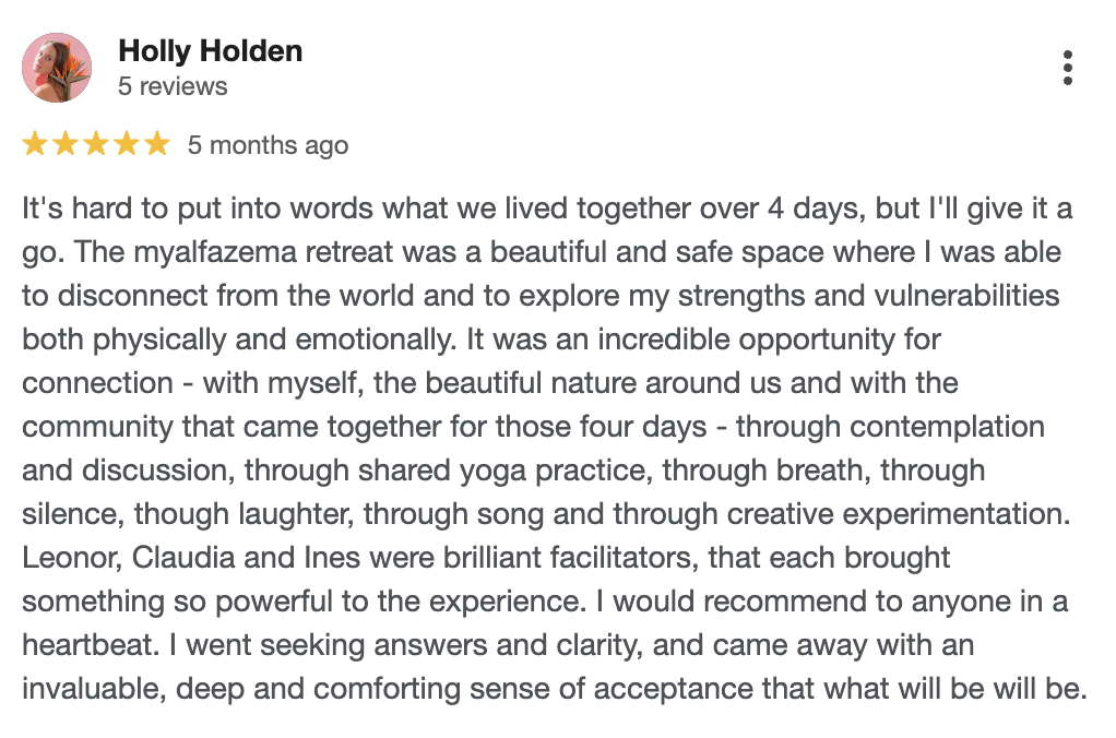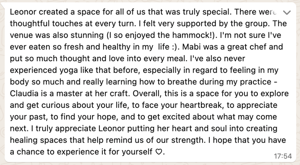 Above all, this is a shared journey. Leonor creates spaces where people feel safe to slow down, soften, and reconnect with what truly matters. And each person brings something unique to the space, so together we co-create a transformative retreat experience.